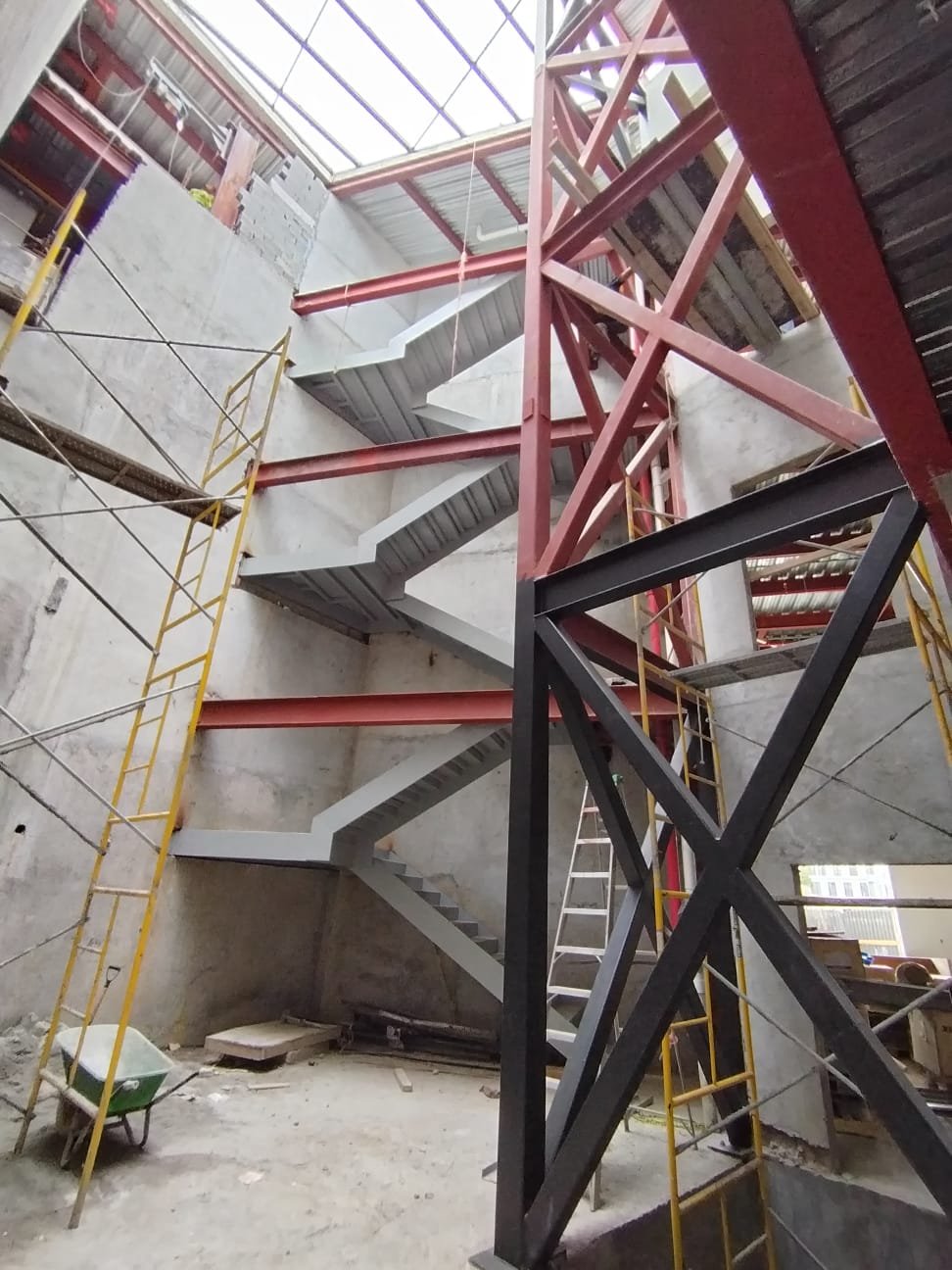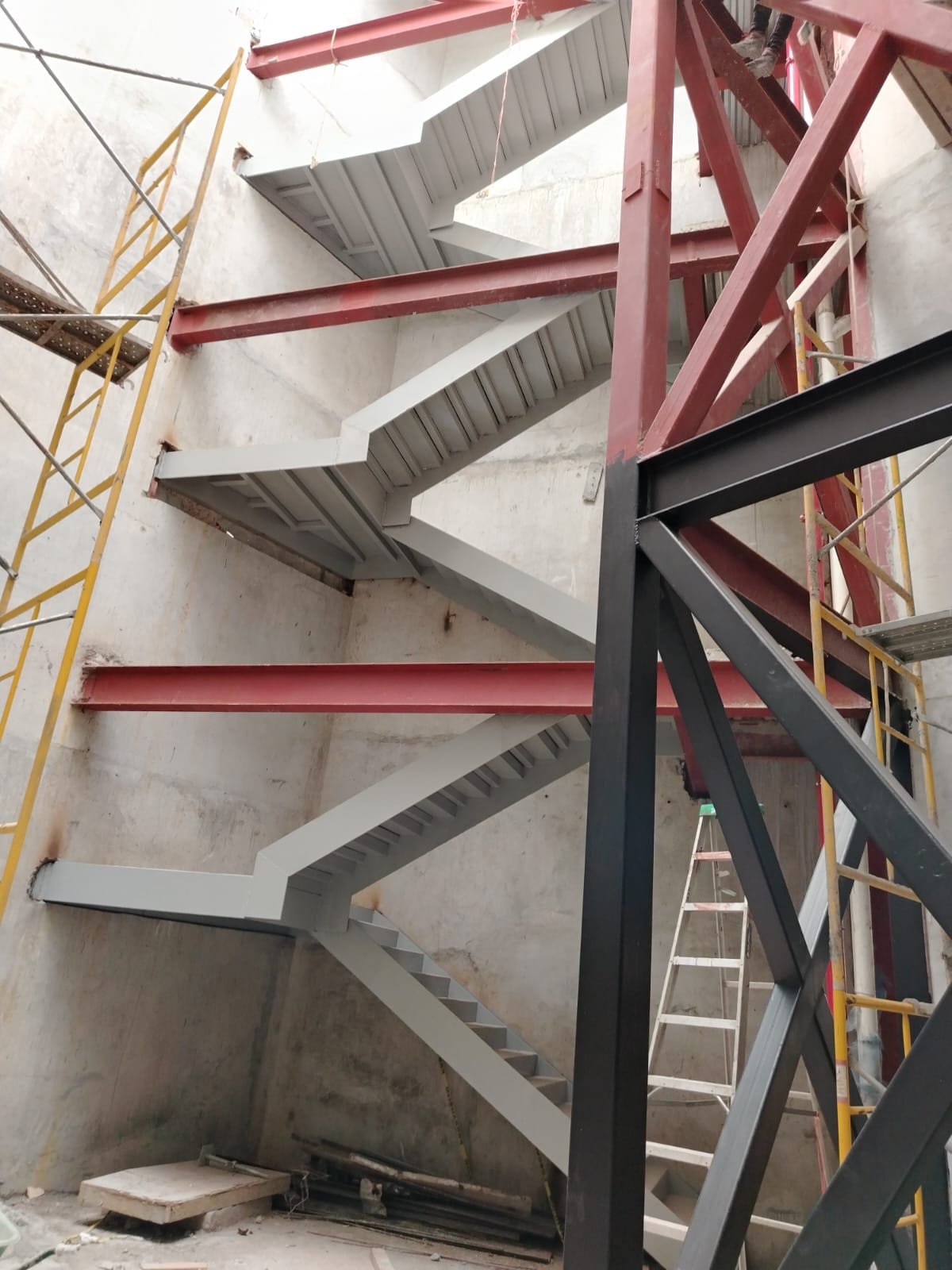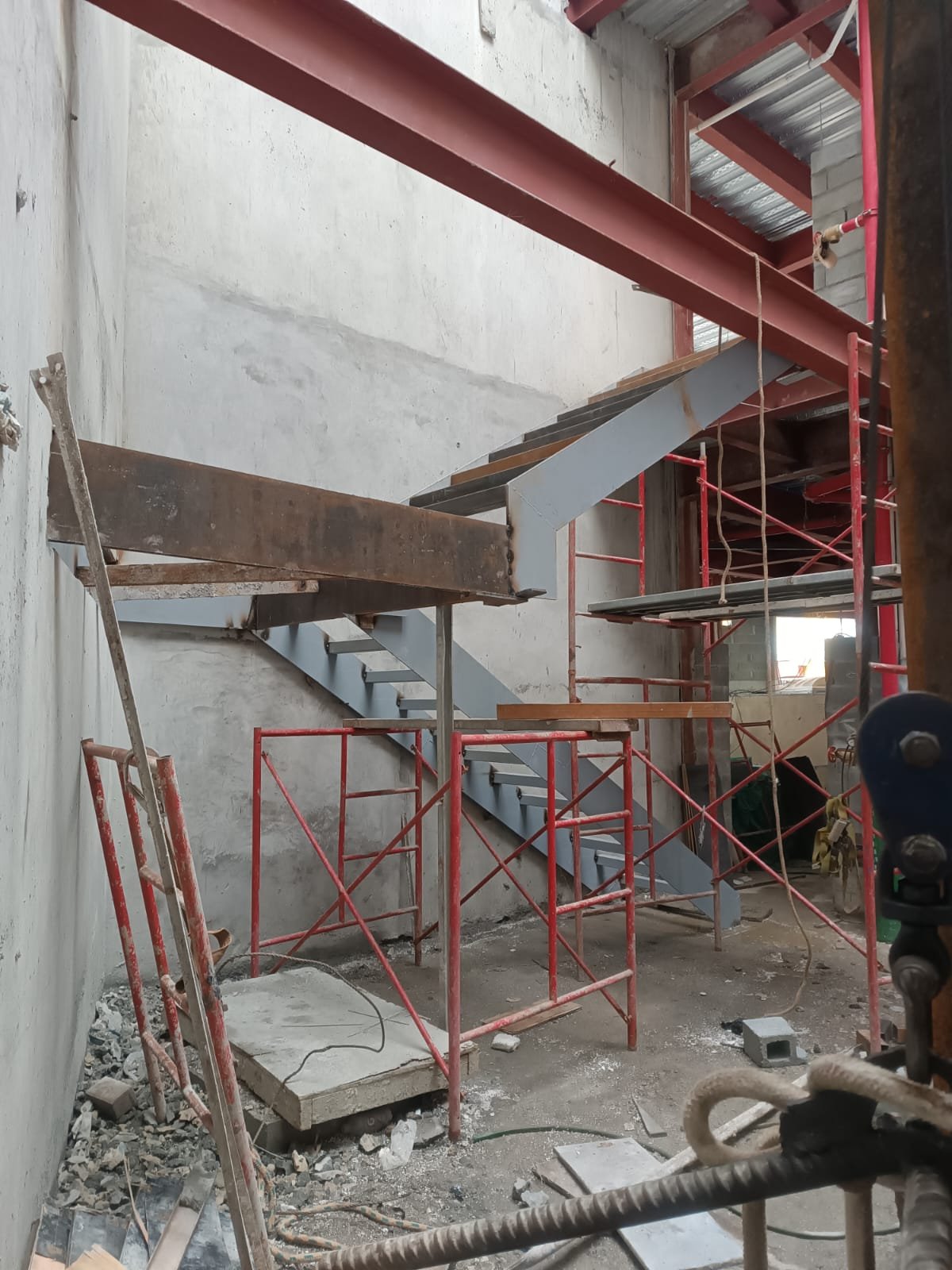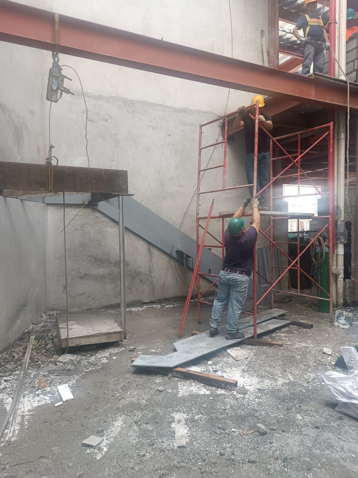 Escalera Metálica Principal: Consistió en la fabricación e instalación de una escalera metálica de tres niveles de altura. La estructura y los peldaños fueron construidos íntegramente en láminas de acero, siguiendo las especificaciones y planos suministrados por la firma de arquitectos MALLOL Arquitectos, S.A. Las piezas fueron prefabricadas en taller, garantizando la precisión dimensional, y posteriormente ensambladas en sitio, optimizando la Calidad de Montaje en un sitio de alta complejidad como Casco Viejo.